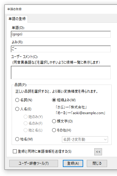 品詞についてですが、何で登録しても構わないのですが、私は、短縮読みで登録しています。