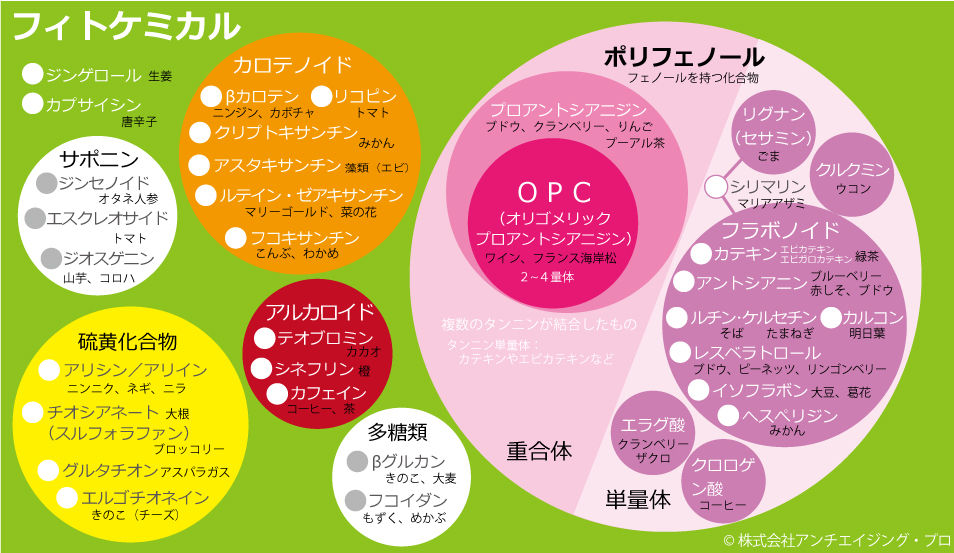 成分の例で言うと、プロアントシアニジン(プロアントシアニン)、レスベラトロール、イソフラボン、カテキン類など。