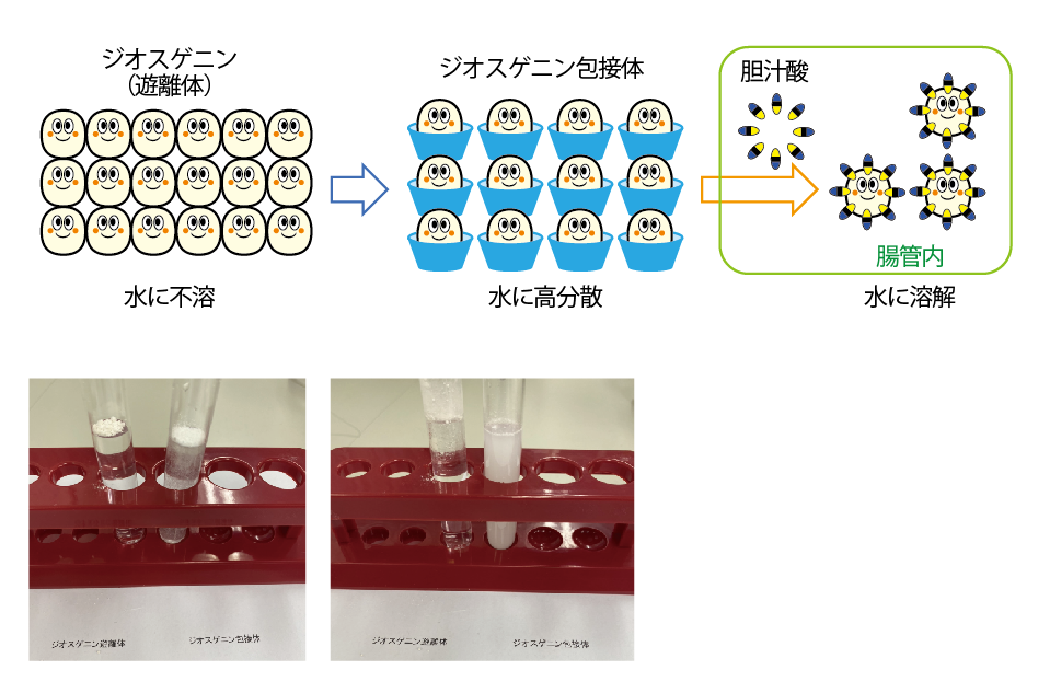 水に溶けないジオスゲニン(遊離体)は、シクロデキストリンに包接体加工することで水に高分散します。そして、腸管でシクロデキストリンが外れて胆汁酸が結合し、水溶性へと変化します。